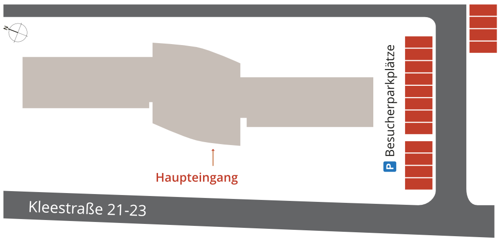 Rechts, neben dem Gebäude (rote Markierung), befinden sich die Besucherparkplätze. Außerdem finden Sie in der Kleestraße zahlreiche öffentliche Parkplätze.